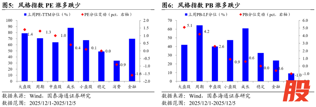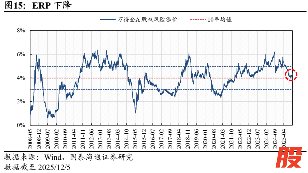 ▶ERP:环比小幅下降。万得全A风险溢价为4.24%,较2025/11/28下降0.03个pct。注:文中估值变动比较为2025/12/5相较2025/11/28;换手率、成交额变动比较为上周(2025/12/1-2025/12/5)均值相较上上周(2025/11/24-2025/11/28)均值。