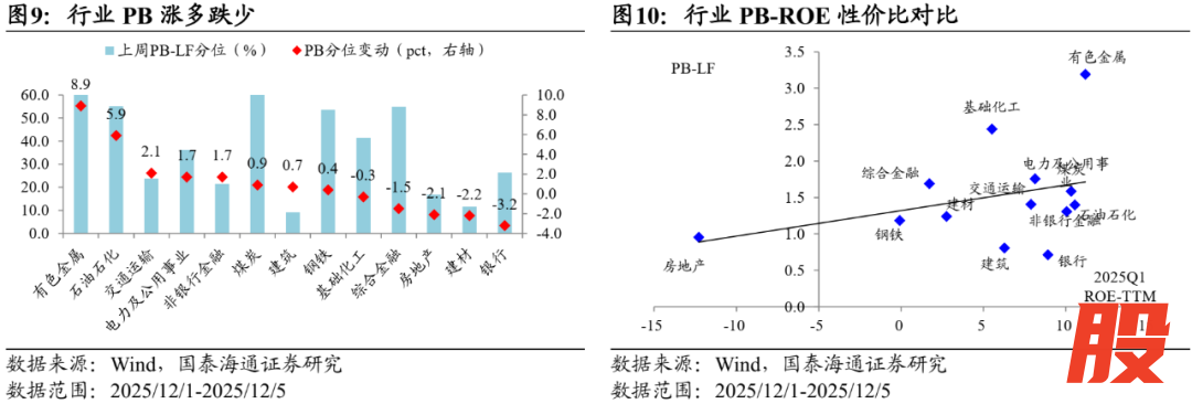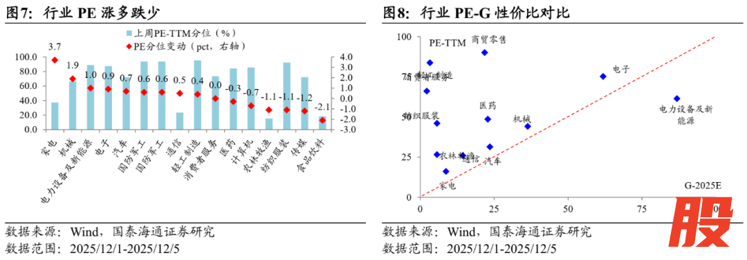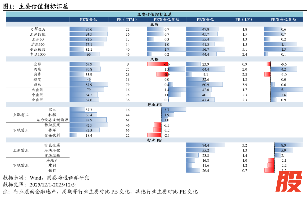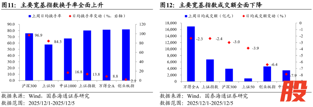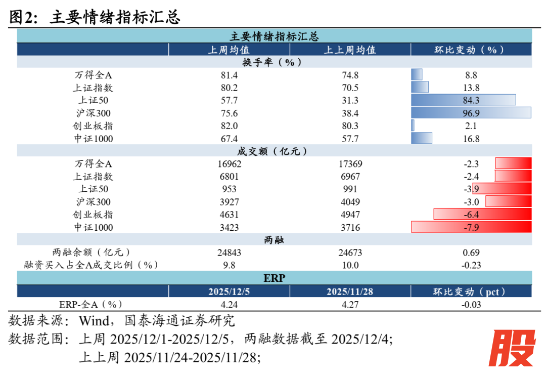 核心观点:上周(2025/12/1-2025/12/5)成交活跃度上升,创业板指领涨。宽基指数:估值全面上涨,创业板指领涨。行业指数:PE估值家电,PB估值有色金属领涨。情绪:交易活跃度上升,换手率全面上升,成交额全面下降。ERP:环比下降。
